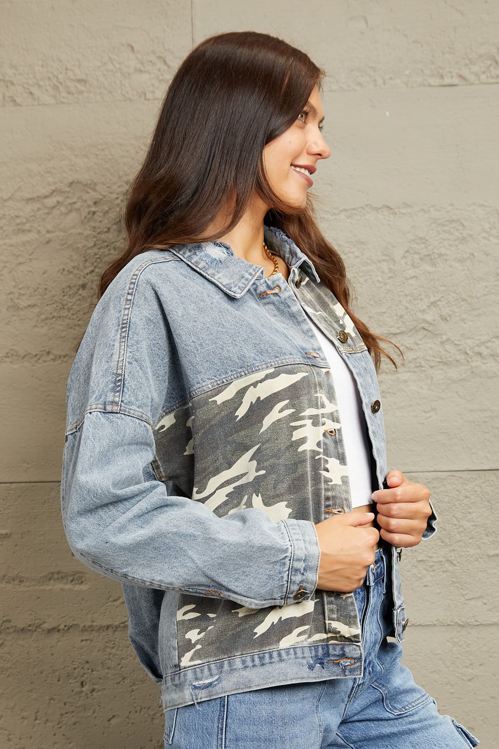 GeeGee Full Size Washed Denim Camo Contrast Jacket
