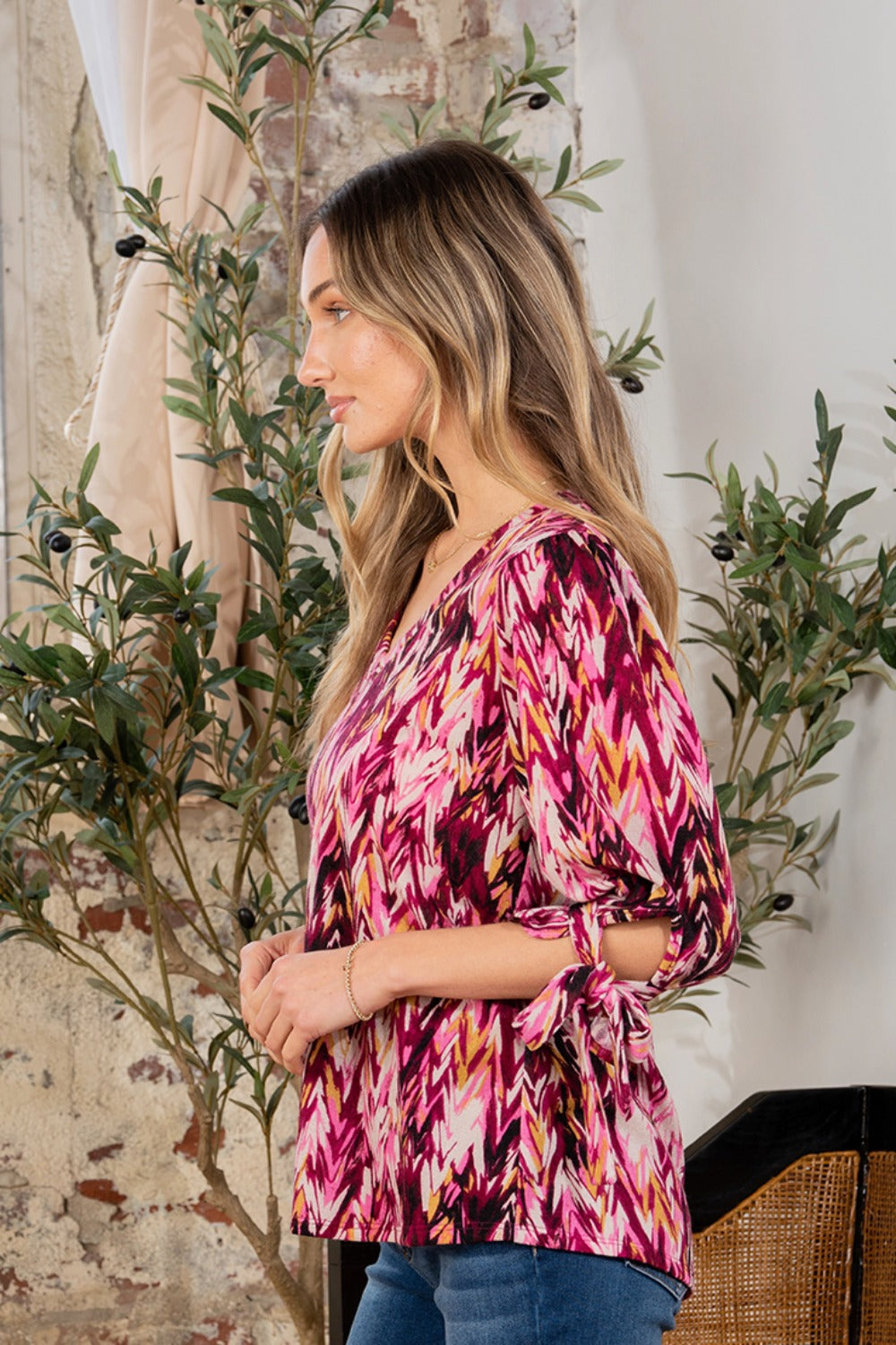 The Printed V-Neck Blouse with Sleeve Knot is a chic and feminine top that will elevate your outfit effortlessly. Featuring a flattering V-neckline and stylish sleeve knots, this blouse combines comfort with a trendy design. The printed pattern adds a pop of visual interest and a touch of sophistication, making it perfect for both casual and dressier occasions. Pair it with tailored pants or a skirt for a polished look, or wear it with jeans for a more relaxed vibe. Stay on-trend and fashion-forward with this versatile and eye-catching blouse.